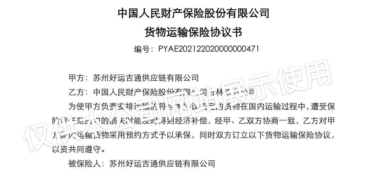 好運(yùn)吉通供應(yīng)鏈蘇州到沈陽(yáng)物流專線自成立以來(lái),始終堅(jiān)持以“實(shí)現(xiàn)貨主最高保障,締造和諧優(yōu)質(zhì)服務(wù)”為企業(yè)使命,為貨主提供全方位的物流運(yùn)輸服務(wù)。好運(yùn)吉通供應(yīng)鏈通過(guò)誠(chéng)信、合作的理念,與中國(guó)人保簽訂了全年貨物運(yùn)輸保險(xiǎn)協(xié)議,為貨主提供貨運(yùn)保險(xiǎn)。真正的為貨主提供運(yùn)輸保障服務(wù)!